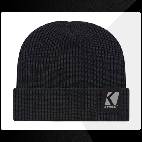 Black knitted beanie with KICKER logo tag.