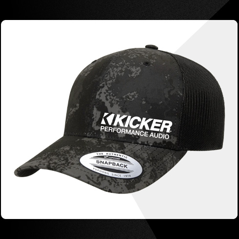 Camo mesh cap. Kicker Performance Audio printed in white.
