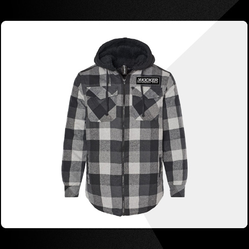Gray/Black flannel hooded jacket with KICKER Performance Audio logo patch on front left chest.