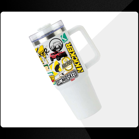 Stainless tumbler with handle, lid and straw. White with multicolored KICKER art work.