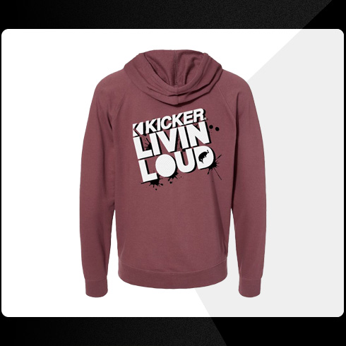 Port color pullover hoodie with with black and white KICKER Livin' Loud logo on back.