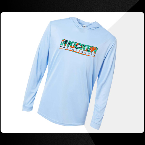 Light blue hooded long sleeve tee with Kicker camo marine logo.