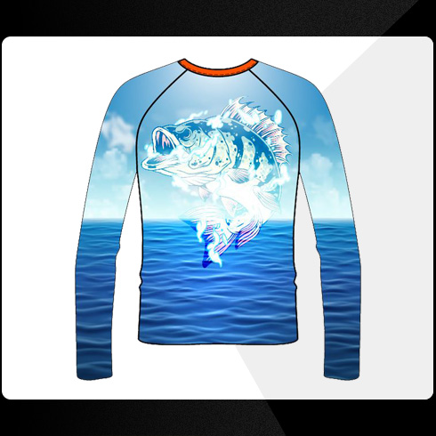 Sky and water long sleeve tee w/ orange KICKER Marine Audio logo on chest and left arm, Go Overboard! in orange on left wrist and fish design on back.