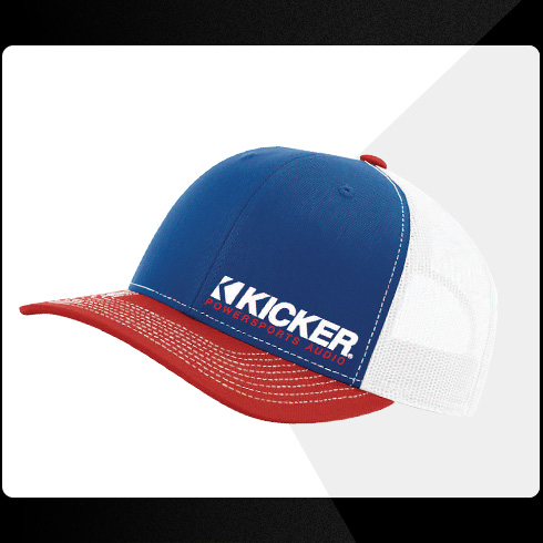 Red, white and blue Meshy. Kicker Powersports audio in white and red.