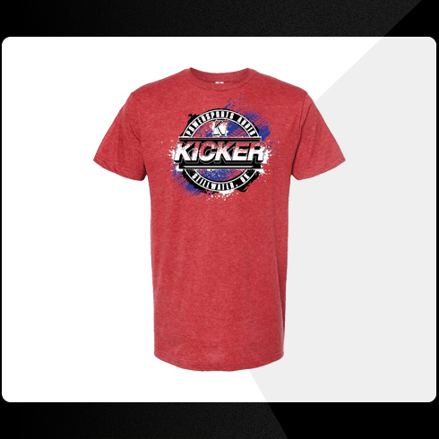 Red tee with Kicker Powersports logo art.